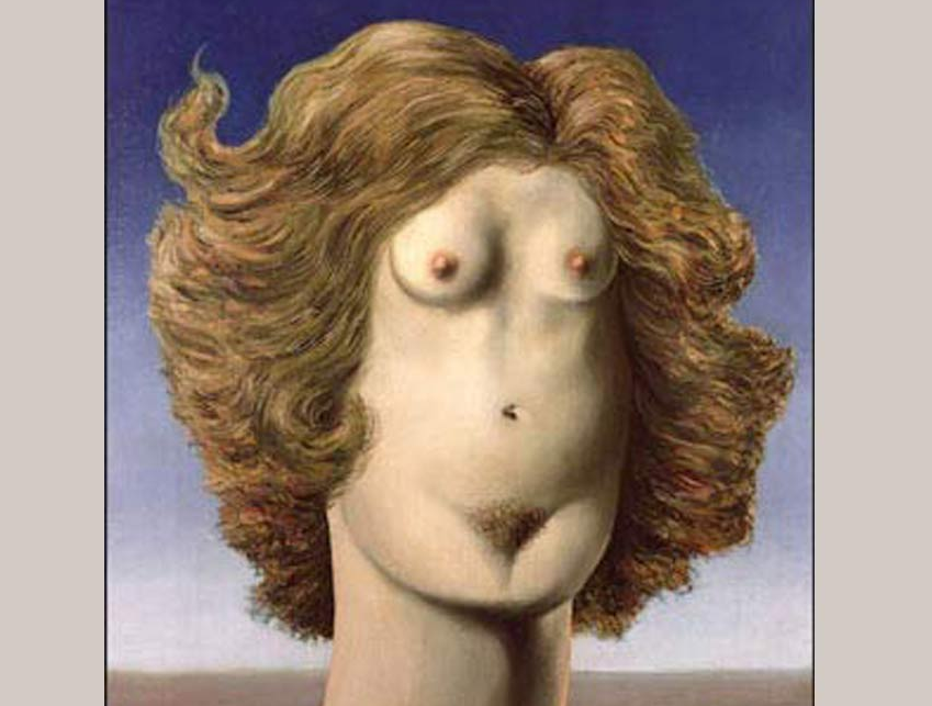 Rape, work of Magritte the great surrealist artist of Belgian origin. The sexual impulse is unconscious, it is an erotic, provocative work. Here we see the difference between love and lust, between full fusion (man-woman) and the unconscious erotic drive. Sex is separate from everything else. There is only the delirium of perversity